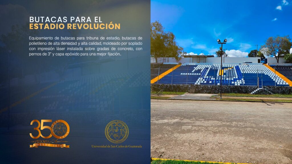 - Nuevas butacas para el Estadio RevoluciónEl Estadio Revolución continúa fortaleciéndose con la instalación de nuevas butacas en su tribuna, un proyecto que mejora la infraestructura y la experiencia de quienes viven la pasión del fútbol sancarlista. Esta iniciativa es impulsada por el presidente del Club de Fútbol USAC, Dr. Carlos Echavarría, con el respaldo del rector M.A. Walter Mazariegos, como… Lee más: Nuevas butacas para el Estadio Revolución