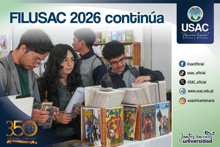 - FILUSAC 2026 continúaLa Feria Internacional del Libro USAC sigue llena de actividades para toda la comunidad: conversatorios, presentaciones, espacios culturales y lectura para todos los gustos. Entrada totalmente gratuita ¡No te lo pierdas! #USAC#OrgulloUniversitario#FILUSAC2026