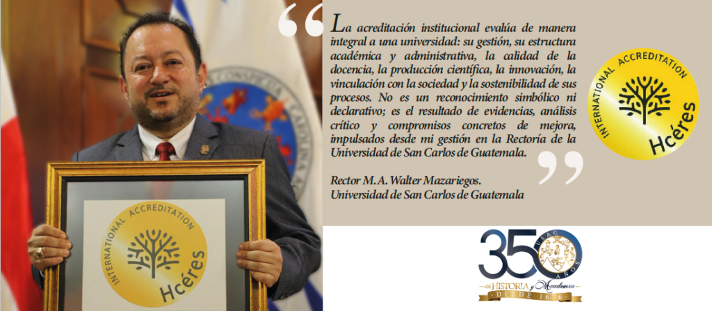 Hoy, en el marco de los 350 años de su existencia, la Universidad de San Carlos de Guatemala se proyecta como una institución internacionalmente acreditada, con estándares globales de calidad académica y gestión científica.